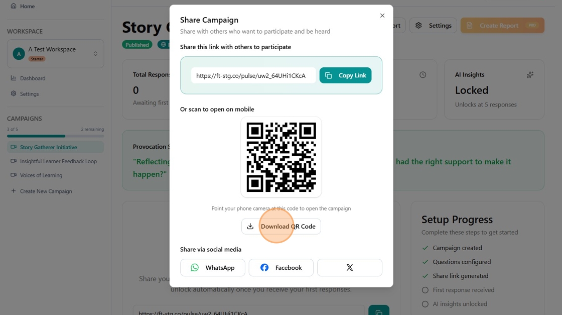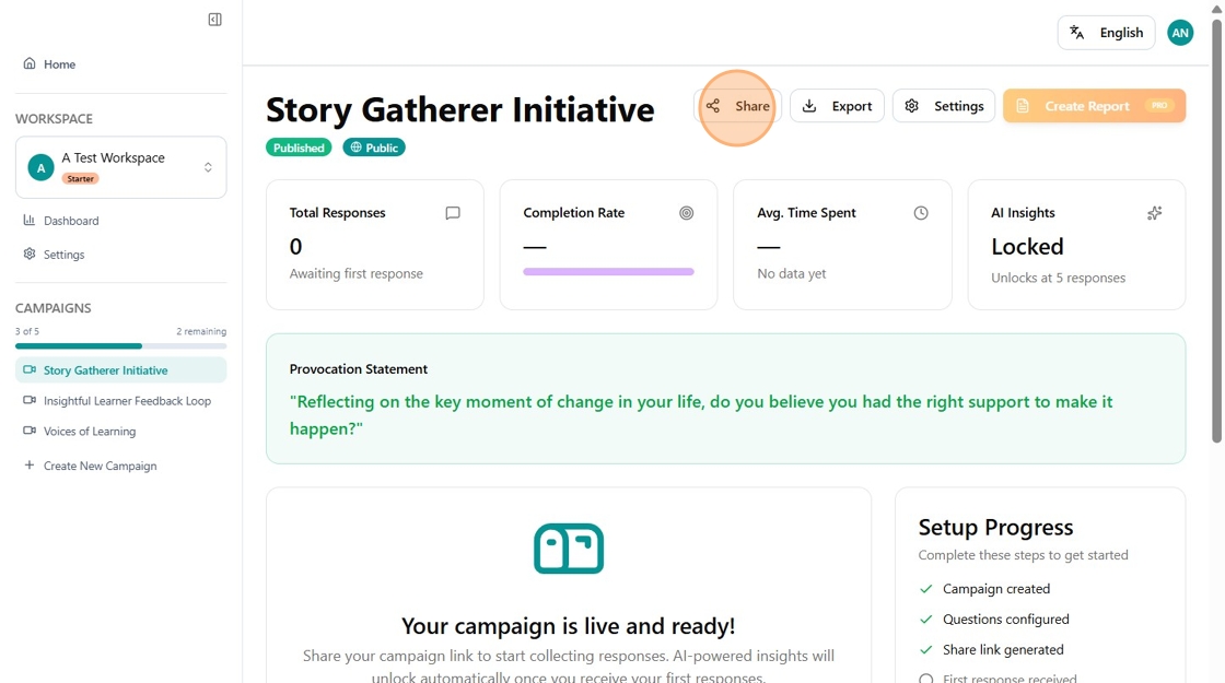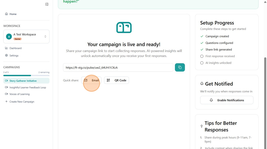 Your campaign is now shared. As participants submit responses, Folktale's AI will begin surfacing insights in your campaign dashboard.