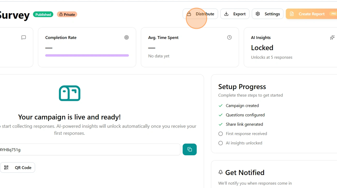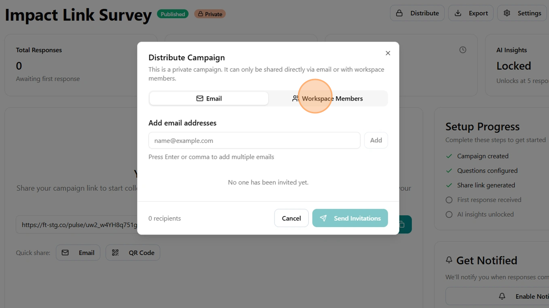 Public campaigns can be shared broadly using a link, QR code, email, or social media. Anyone with the link can respond. Private campaigns use a Distribute flow, where you invite specific participants by email or from your workspace members.
