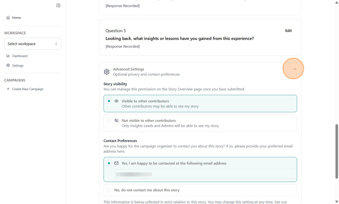 - Review your story visibility setting. Choosing Visible to Other Contributors allows your response to be seen by other participants.