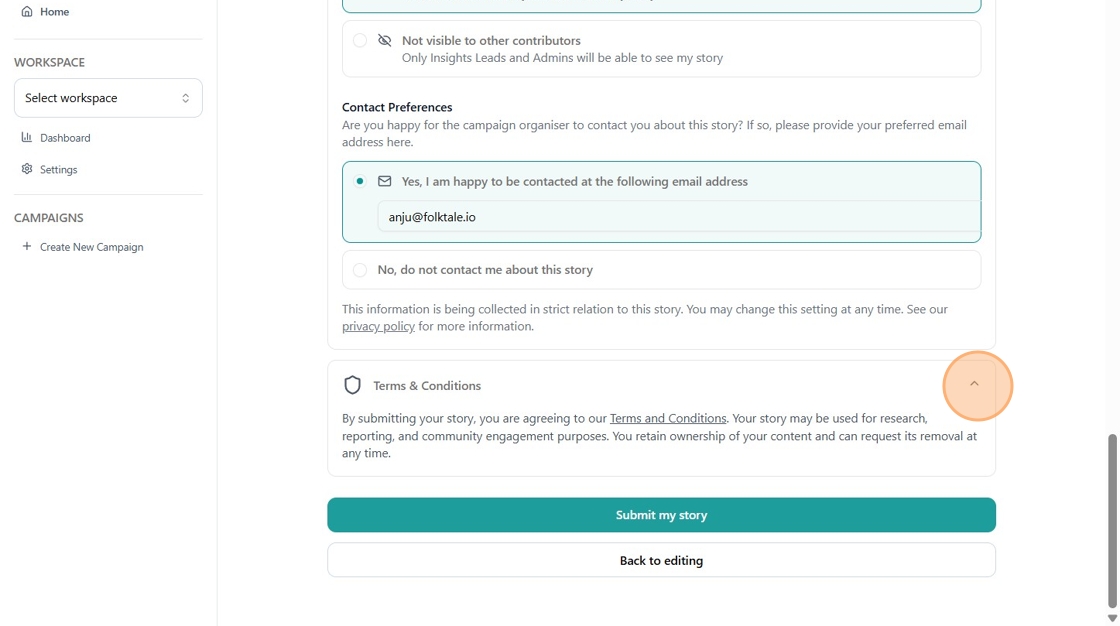 - Open the Terms and Conditions section and confirm you have read and agreed to the terms of both Folktale and the campaign organiser.