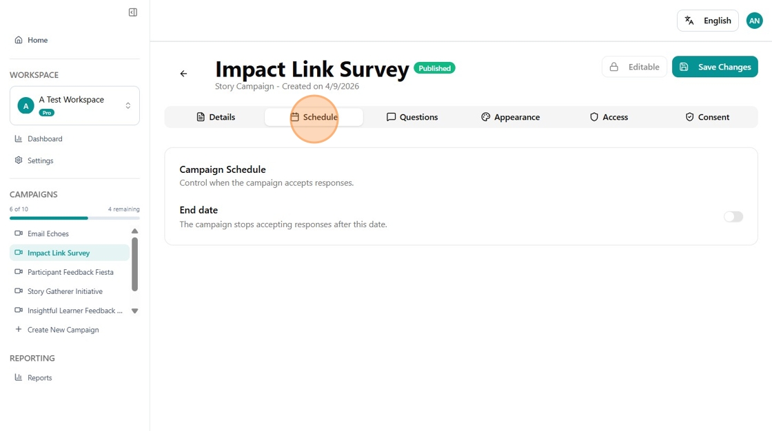 💡 Tip: Setting an end date is optional. If you leave it off, the campaign will continue accepting responses until you manually close it.