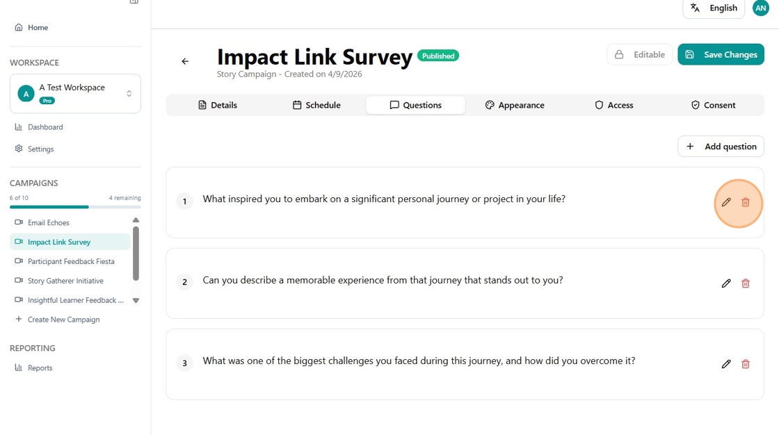⚠️ Important: Changing questions after responses have been received may affect the consistency of your data. Where possible, finalise your questions before the campaign goes live.